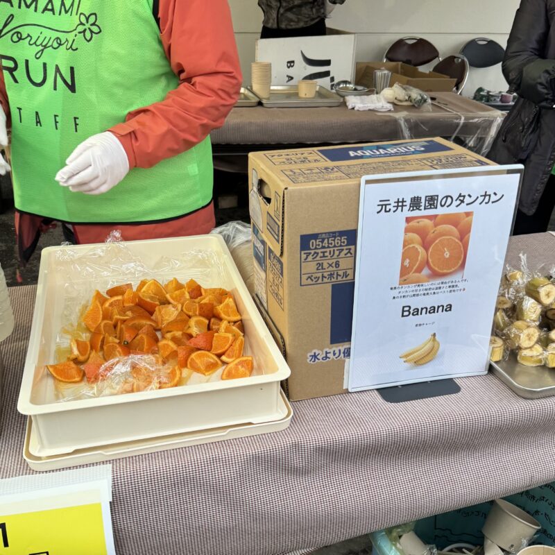 奄美ヨーリヨーリのエイドは汁物が豪華です。また解禁されたばかりの奄美名物の「タンカン」が提供されています。奄美名物がマラソンを走れば食べられるようになっています。さらにどれも美味しいです。