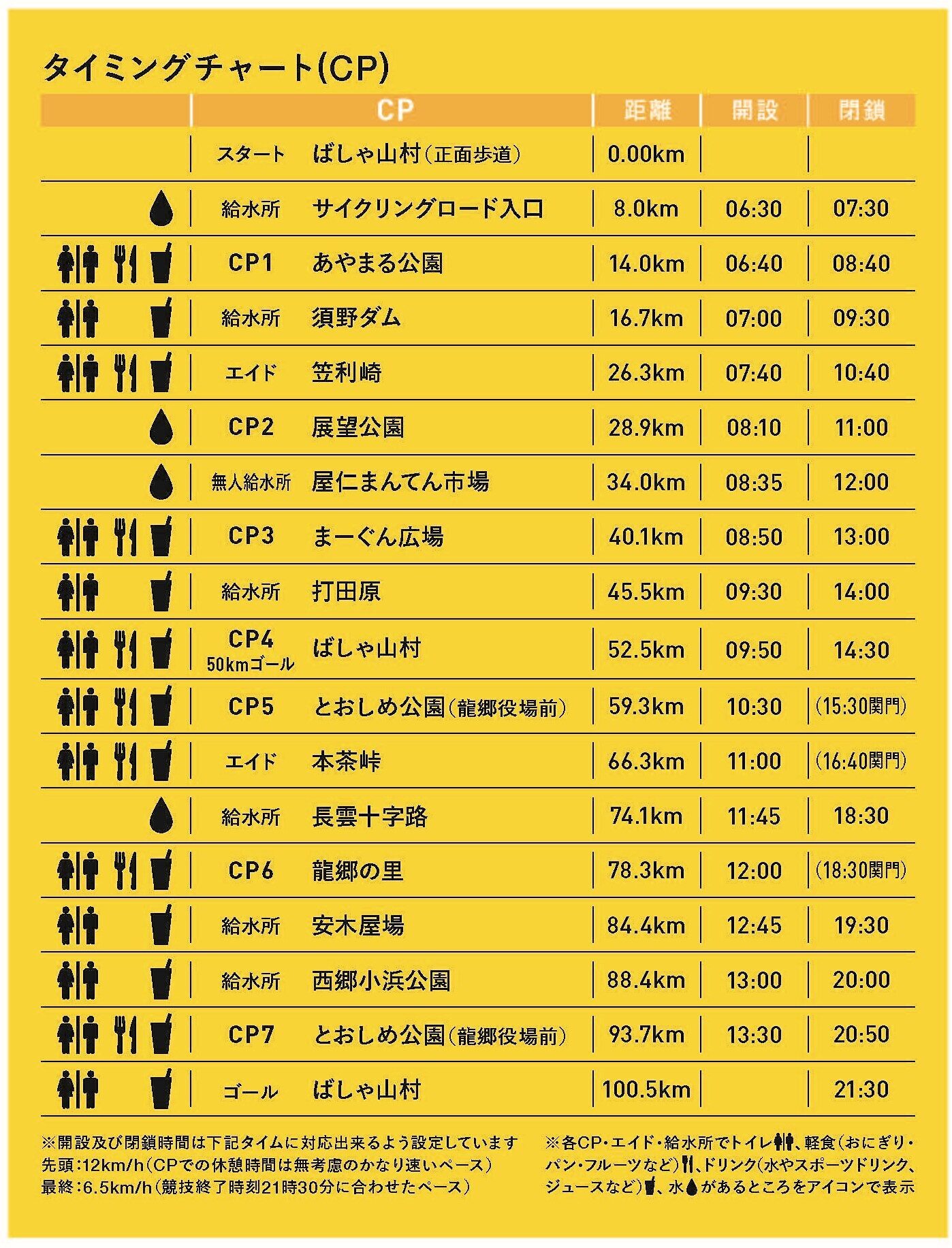 - 制限時間: 100km 15時間30分, 50km 8時間30分