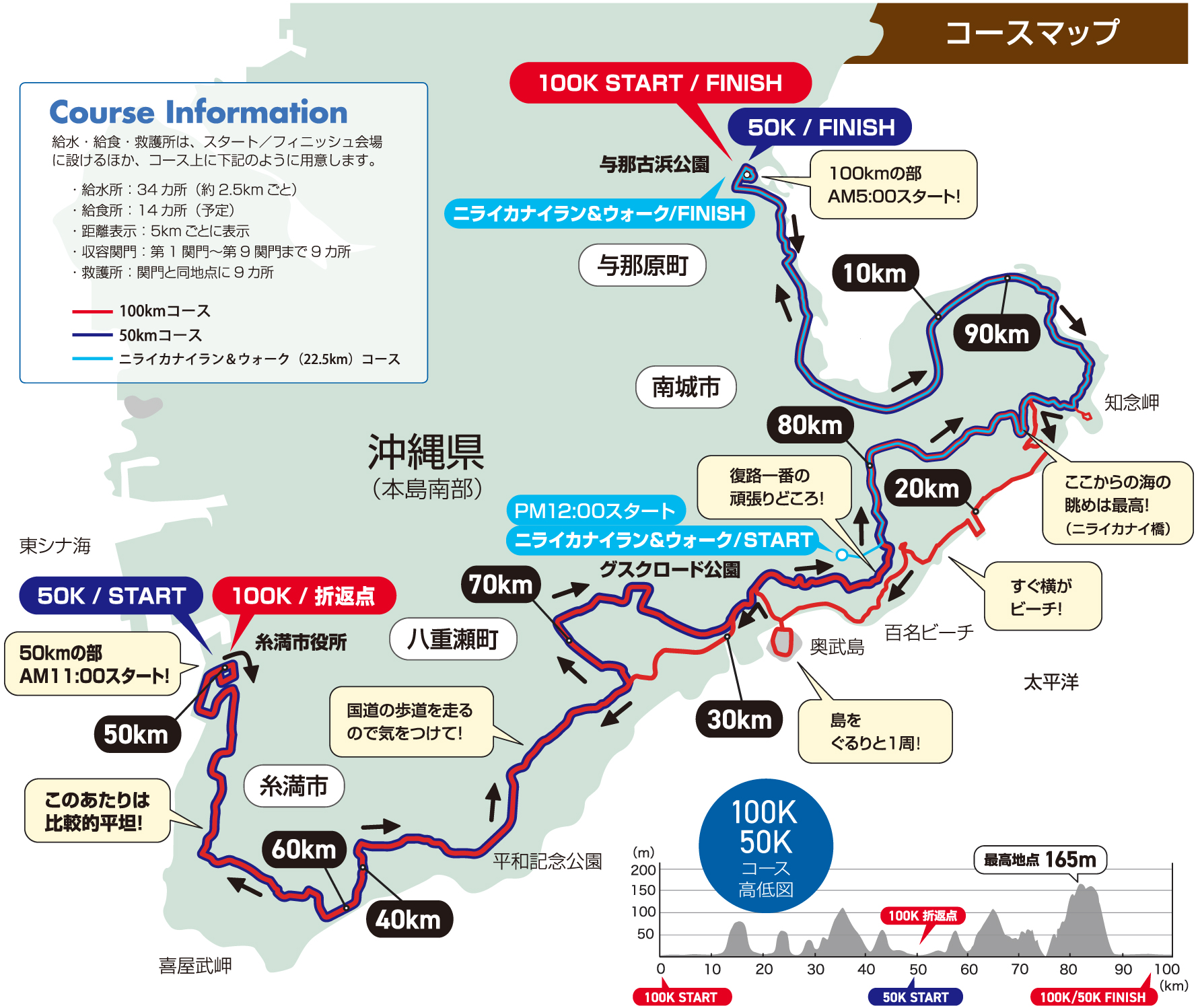 - 受付: 前日:琉球新報社1F広場, 当日:与那古浜公園(100km)