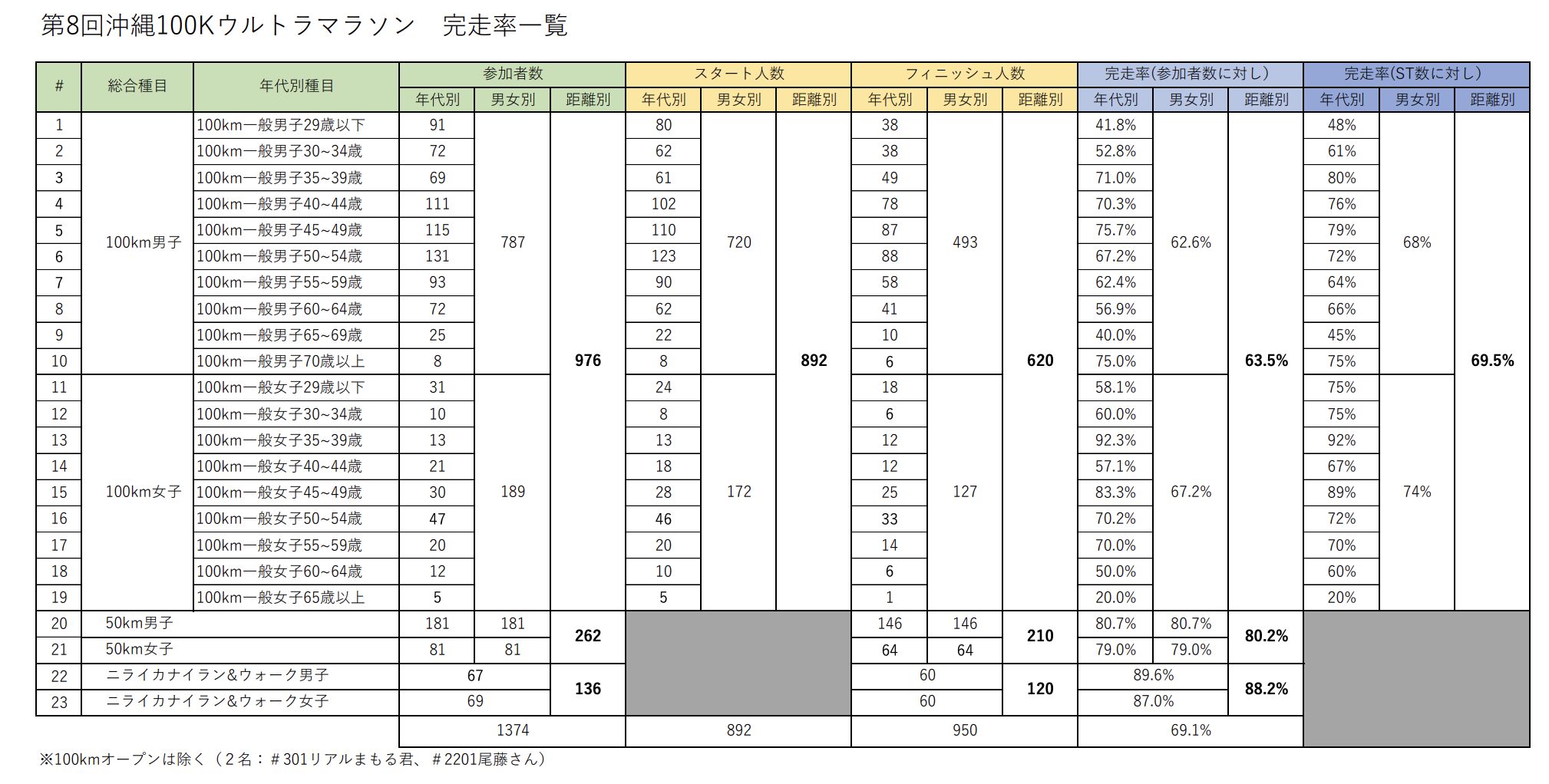 完走率はスタート人数に対して69%とウルトラマラソンの中では高いです。走りやすいコースと充実したエイドと気候により高くなっていると思われます。