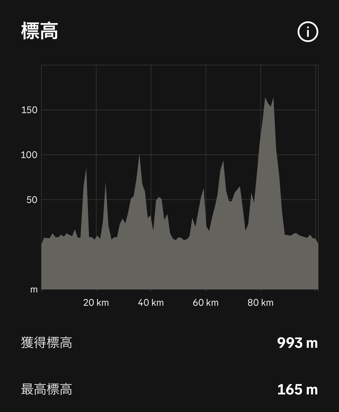 累積標高は993mと100kmウルトラの中では低いです。ところどころ走れない坂はありますが、距離が200〜500mと短いので歩いても問題ありません。その他の坂は走れるレベルの傾斜です。